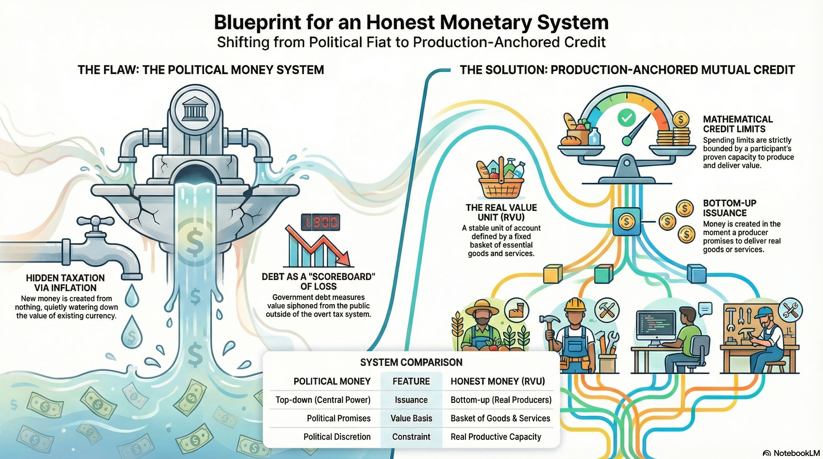 I recently had a conversation with Copilot about designing an honest and effective exchange system that would circumvent the flawed and exploitative fiat money system. I began by saying, “The political money system is structurally flawed, and its eventual collapse is inevitable. That may occur slowly over time via inflation or suddenly with a declared devaluation; in either case the users of the currency suffer losses. Government debt is merely a measure of how much value has been taken from the people outside of the overt tax system. Let’s design an honest monetary system where issuance cannot outrun real output of goods and services.”