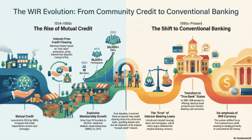 I have long maintained that the Swiss WIR Economic Circle Cooperative, as originally conceived and operated, was the most successful and best example of an honest moneyless exchange system. It was based on the mutual credit clearing of obligations incurred by small- and medium-sized businesses in the course of their day-to-day trading with one another. But over time, the WIR morphed into a conventional bank whose primary business has become, like all the other banks, the creation of interest-bearing debt by granting Swiss franc loans.