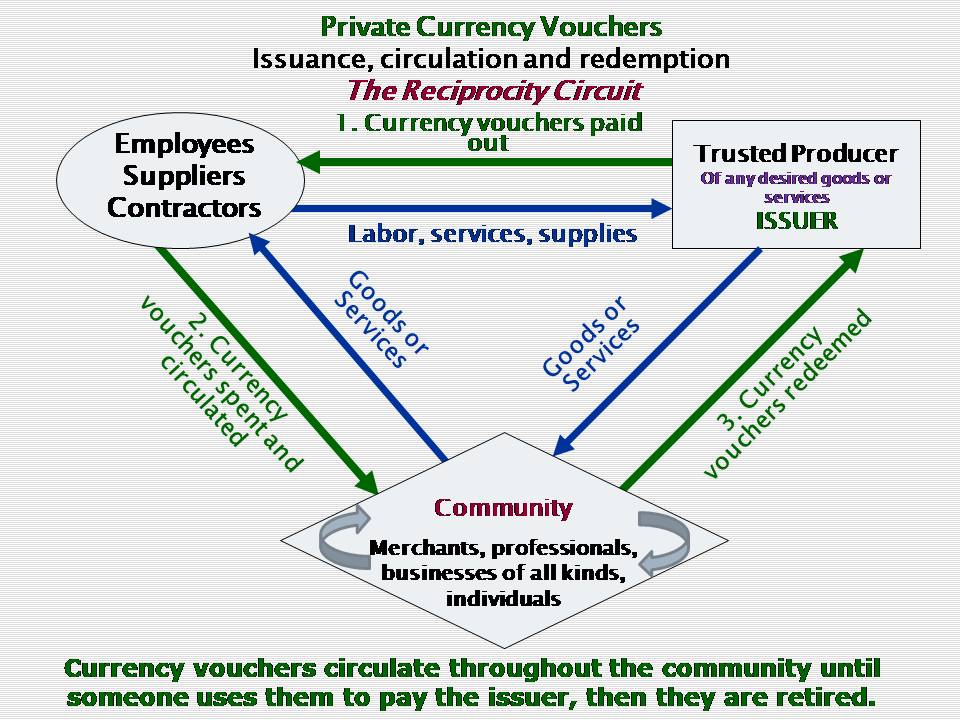 It has long been my position that a real alternative to fiat money as a means of payment requires reclaiming the “credit commons,” i.e. establishing community control over credit. It is producers and sellers of real value who are the ones who are actually qualified to issue a currency into circulation. They can do so individually by using their own private voucher currencies redeemable for the goods and services they are ready, willing, and able to provide, or they can do it in cooperation with others by pooling their commitments and jointly issuing a common voucher currency. Such a currency can then circulate generally for other to use to pay one another instead of using dollars. Euros, pounds, or other government fiat currencies.